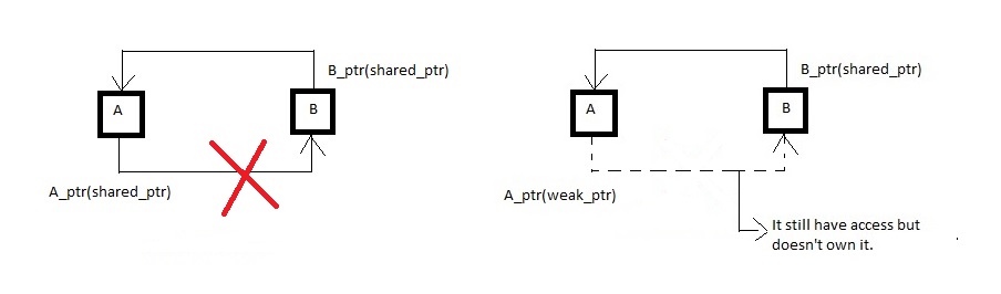 这就是我们使用弱指针(weak_ptr)的原因,因为它们不是引用计数的。因此,声明 weak_ptr 的类不具有强大的保持力,即所有权不是共享的,但是它们可以访问这些对象。