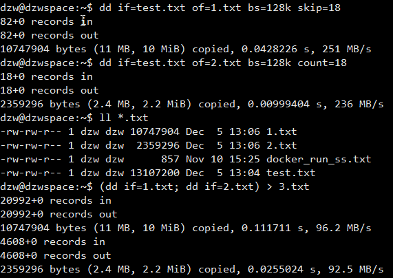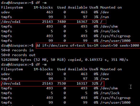上述命令是实际写入硬盘,文件产生速度取决于硬盘读写速度,如果想要产生超大文件,速度很慢。