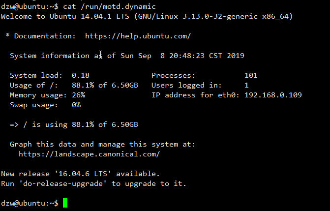 在较新的Linux版本中,静态 /etc/motd 未启用,启用的是动态 /run/motd.dynamic